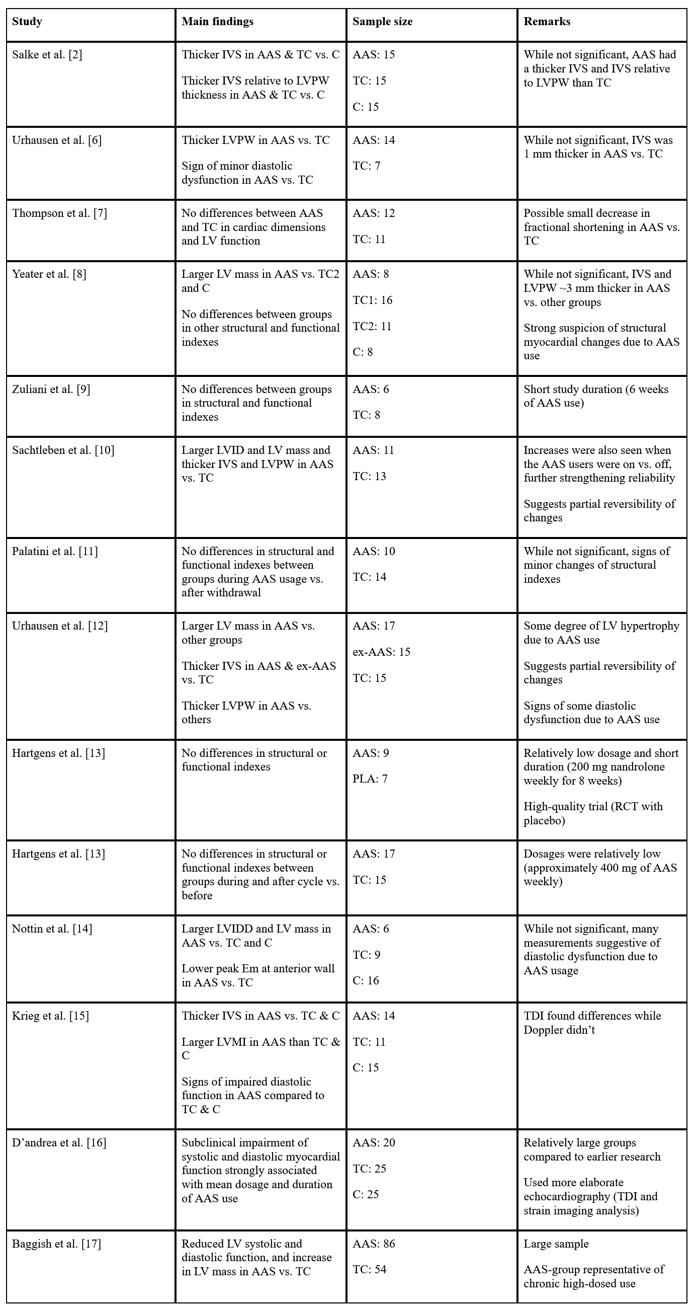 The HAARLEM trial was a prospective study conducted by the outpatient clinic for anabolic steroid users in the Netherlands [18]. In brief, 100 anabolic steroid users were followed over time while they self-administered AAS. Mean dosage, based on label information, was 898 mg per week, thus making their AAS cycle quite representative of common usage by bodybuilders. Measurements were taken before, during, as well as 3 months after the end of their cycle and 1 year after the start of their cycle. A total of 31 subjects of this sample also underwent echocardiographic measurements. Notably, they applied 3D echocardiography with some badass equipment (Philips Epiq 7). Due to the prospective nature of this trial, the good sample size, the modern equipment, and the representative AAS usage of the subjects, this trial delivers some high-quality data.