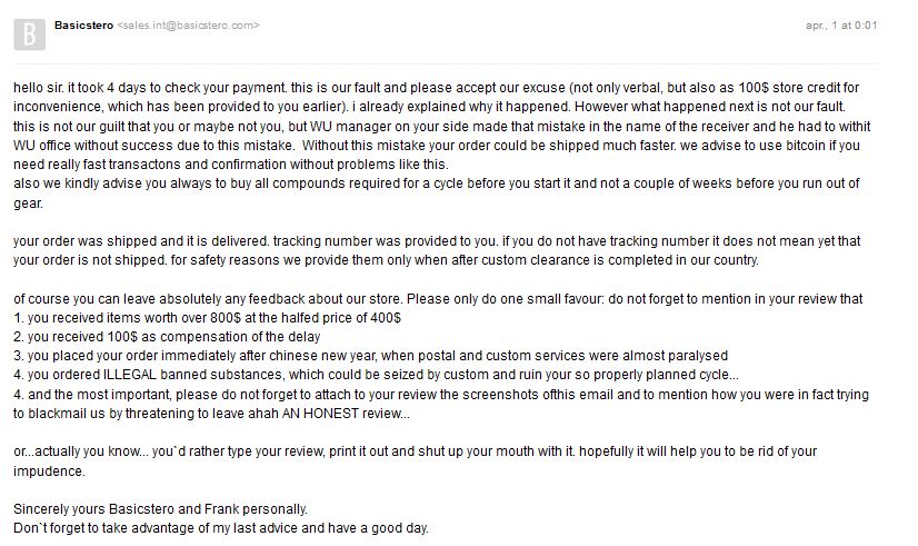 And now seriously. Yes we can fuck up. We are still young as a store and do improvements all the time. We increase our men power, etc. But yes we can fuck up, this happens with absolutely every store, and much more if it is about ILLEGAL substances. In this case we delayed with checking his payment. He or WU made a mistake in the name of the receiver, which caused furthr sequences. We excused as you can see it in my reply.